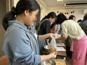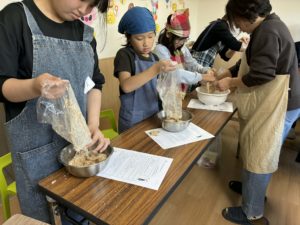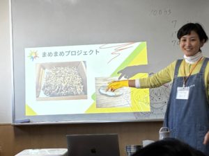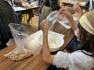 代表の冨田さんが子どもたちに、「わくミラの畑で取れた大豆はこの小さな袋1つ分でした。初めて畑で育てた大豆は、収穫してさやから出すと残念ながらカビが生えているものがたくさんありました。大豆を育てるって難しいね。これでは足りないので、今日は国産の大豆も用意しました。」と説明されていました。子どもたちには、やってみて、失敗することで学んでほしいと、積極的に体験する場をつくっておられるそうです。