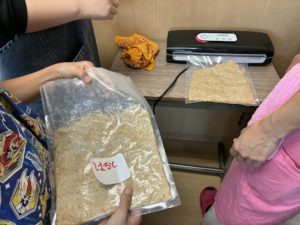 いよいよ最後の作業です。団子状にまとめたものを真空パック用のポリ袋に入れ、空気を抜くように平らに伸ばしたら、真空機で真空状態にして完成です。