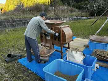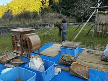 秋に稲刈りをした田んぼでは、ご近所の農家から譲り受けた足踏み脱穀機と唐箕を使った作業が進んでいました。