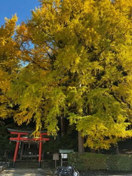 活動場所最寄りのバス停「小野郷」に着くと、目の前にある岩戸落葉神社の紅葉が見事でした。ここから迎えに来ていただいた車で10分程行ったところが活動場所の集落です。