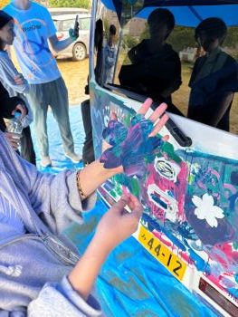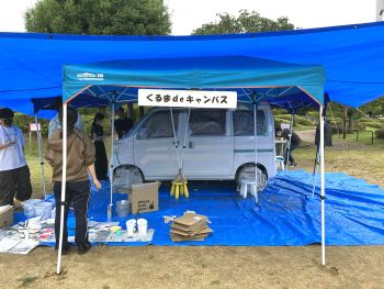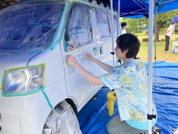 本日の活動、カーペインティングの準備が始まりました。企画の連携事業者でスプレーアート等の活動をされているアーティスト山中さんのご指導のもと、スタッフと学生ボランティアでペンキの準備や色がのりやすいよう車のやすりがけ作業が進みます。