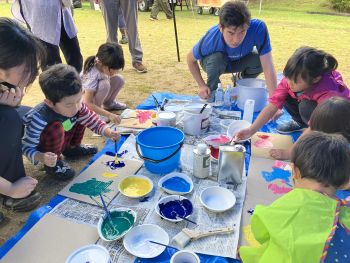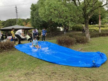 ペインティング活動を終えた子どもたちは、学生ボランティアと一緒に公園を走り回ったり、昔遊びコーナーで遊んでいました。手作りのウォータースライダーも登場し、遊びに全力です。