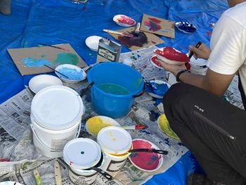 手や段ボールのパレットにいっぱいペンキをつけて、思い切り描き進めます。