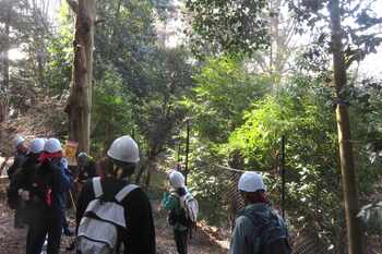 この日は「観察の森づくり」として森の手入れと植樹を体験しようと開催された会に、市民20名程が集まりました。高校生の参加もありました。みなさんはボランティアとして森の手入れ、調査、また学習会や観察会などの活動を通じ、長く学習されています。この日も作業前に観察の森の特徴紹介や森ができるには何を必要とするのかなど、今回が初めての参加者にもわかりやすく説明をされました。