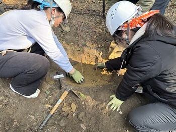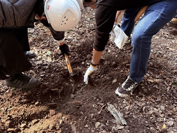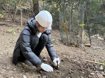 苗木の配置が決まると、植え方にも注意があり、表面の黒い土の下にある、色の薄い土「心土」を探します。植樹にはこれが必要で、掘り進めても腐葉土ばかりの場所や表面すぐに心土にたどり着く場所もあり、土砂の流れやもともとの地形が想像できました。